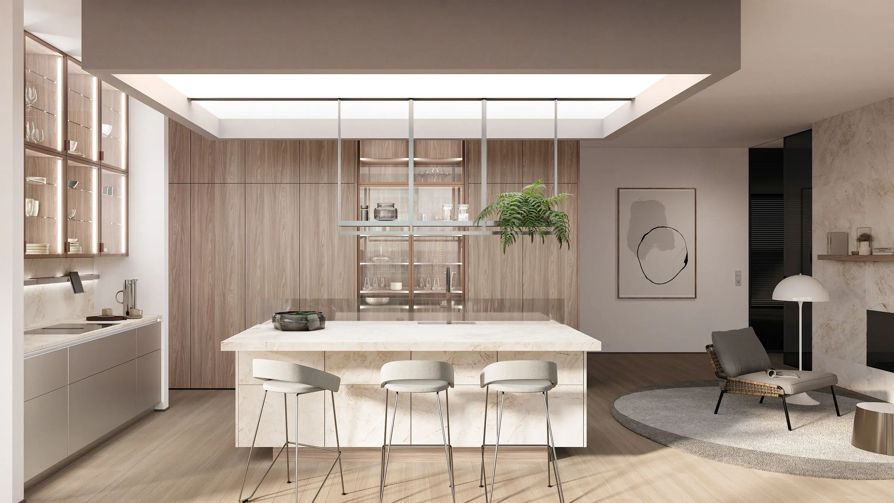 Moderne Küche mit Kochinsel, Holzschränken und Glastür-Vitrine