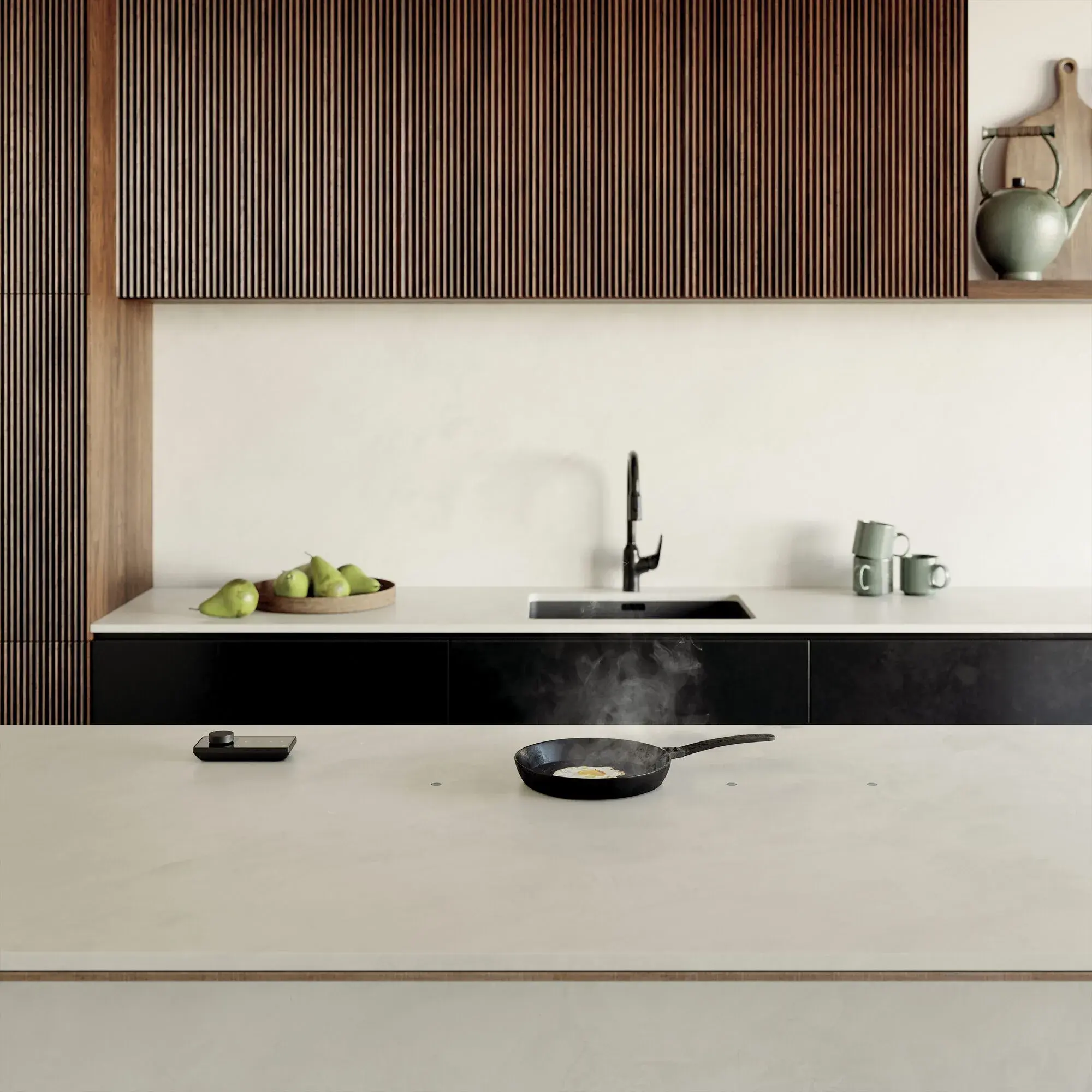 Auch beim Kochen selbst lohnt sich ein Blick über den Tellerrand hinaus. Warum nicht das klassische Kochfeld hinterfragen? Manche Menschen brauchen mehr Platz und wünschen sich fünf Kochzonen nebeneinander. Andere wollen flexibel kombinieren, etwa Induktion und Gas. Und wer eine besonders puristische Ästhetik sucht, entscheidet sich für ein unsichtbares Kochfeld wie die Novy Undercover, deren Induktionstechnologie vollständig in die Arbeitsplatte integriert ist.