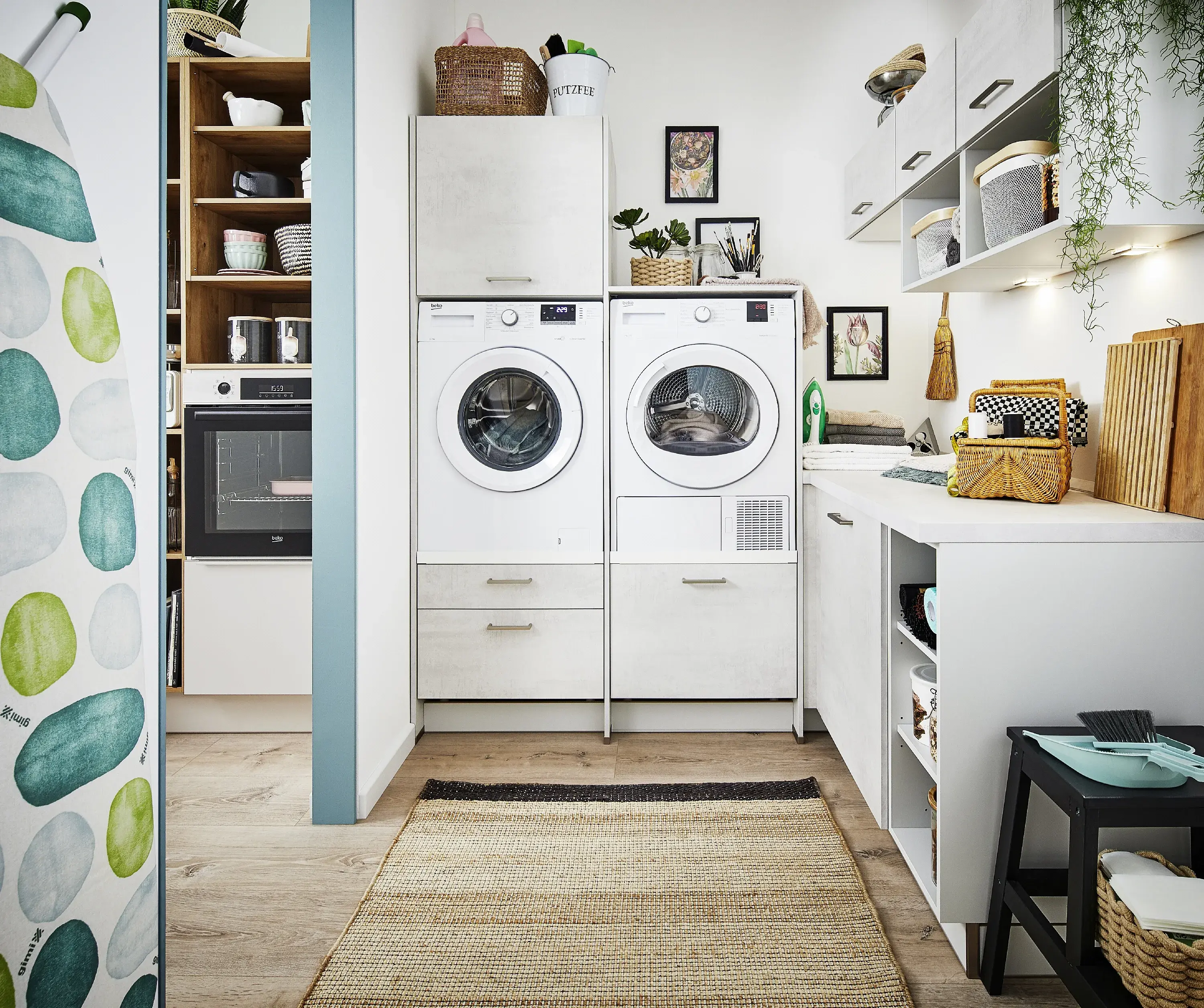 Auch für Hauswirtschaftsräume hat pino praktische Lösungen parat: Durchdachte Schubladen- und Hochschranksysteme bieten ausreichend Platz für alle Utensilien, von Schmutzwäsche und Waschmittel über Kleinteile bis hin zu sperrigen Haushaltshelfern – alles lagert griffbereit!
